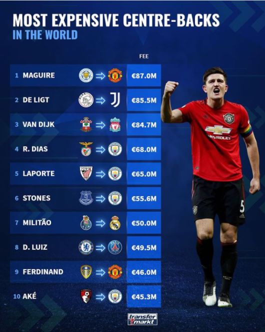 축구 이적 시장 매체 '트랜스퍼 마켓'은 최근 역대 가장 비싼 몸값을 자랑했던 센터백 순위를 공개했다.