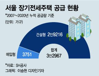 장기전세주택은 SH공사가 공공택지 개발자로 나서 직접 공급하는 건설형과 민간 재개발, 재건축 사업장 기부채납 등을 통해 확보한 주택을 서울시가 사들여 공급하는 매입형으로 크게 나뉜다. 그동안 공급량 대부분은 건설형에 의존했다. SH공사에 따르면 장기전세주택 공급량의 약 90%인 2만9216가구가 건설형이다.