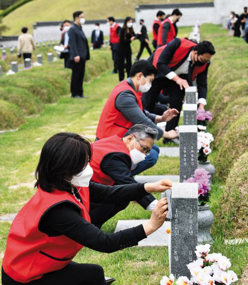 /연합뉴스 국민의힘 김미애(맨 왼쪽) 의원 등 초선 의원들이 10일 광주 5·18 국립묘지에서 참배한 이후 묘비를 천으로 닦고 있다. 이들은 “신군부에 맞선 오월 광주의 희생은 한국 민주주의의 상징”이라며 “광주 정신은 통합과 화합의 씨앗이 되어야 한다”고 말했다.- Copyrights ⓒ 조선일보 & chosun.com, 무단 전재 및 재배포 금지 -