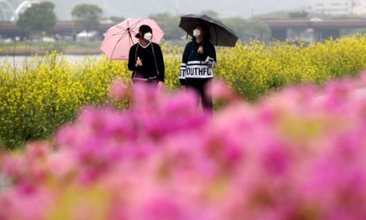 울산 중구 태화강변에서 우산을 쓴 시민들이 철쭉과 유채꽃이 만발한 산책로를 거니는 모습.뉴스1 |