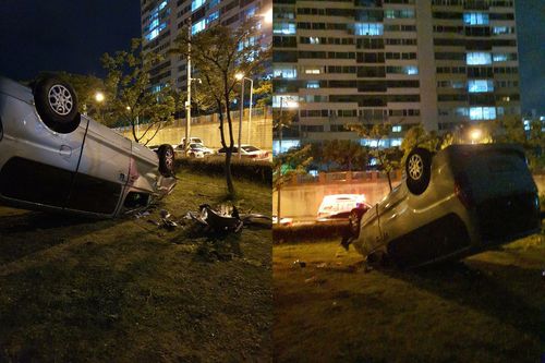 부산서 음주운전 사고로 뒤집힌 승합차 |