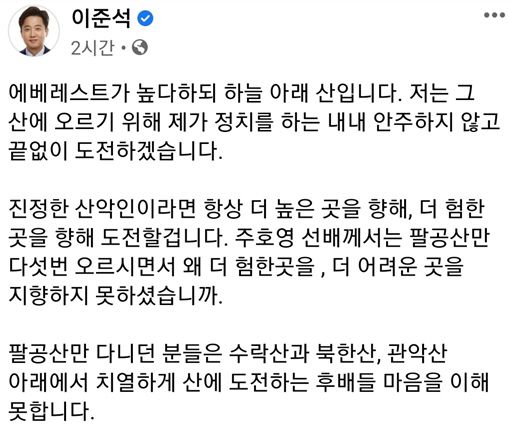 이준석 전 최고 위원은 곧바로 자신의 페이스북에 "에베레스트가 높다하되 하늘 아래 산이다. 저는 그 산에 오르기 위해 제가 정치를 하는 내내 안주하지 않고 끝없이 도전하겠다"며 "진정한 산악인이라면 항상 더 높은 곳을 향해, 더 험한 곳을 향해 도전할 것"이라고 말했다.