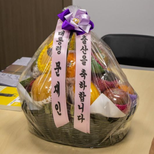 용 의원이 공개한 사진에 따르면 이 과일바구니에는 “출산을 축하합니다. 대통령 문재인”이라는 문구가 적힌 리본이 달려 있다.