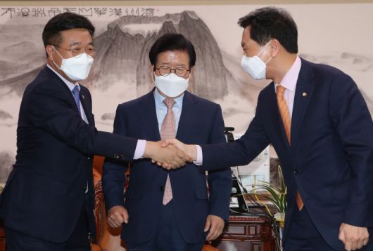 여야 원내대표, 두 번 만남에도… 윤호중 더불어민주당 원내대표(왼쪽)와 김기현 국민의힘 대표 권한대행 겸 원내대표(오른쪽)가 11일 국회에서 박병석 국회의장(가운데) 주재로 회동하기 전 악수를 하고 있다. 국회사진기자단 |