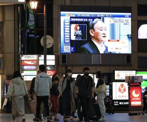 (오사카 교도=연합뉴스) 7일 오후 스가 요시히데(菅義偉) 일본 총리가 신종 코로나바이러스 감염증(코로나19) 긴급사태에 관한 기자회견을 하는 모습이 일본 오사카(大阪)시 도심에 설치된 대형 스크린에 중계되고 있다. |