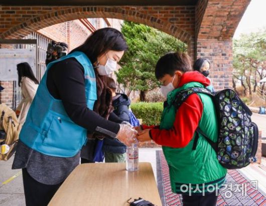 2일 오전 서울시 강남구 포이초등학교에서 개학 첫날을 맞아 학생들이 등교하며 손 소독을 학고 있다./사진공동취재단 |