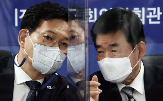더불어민주당 송영길 대표와 김진표 부동산특별위원회 위원장이 12일 오후 서울 여의도 국회 의원회관에서 열린 부동산특별위원회 회의에서 대화하고 있다.(사진=연합뉴스) |