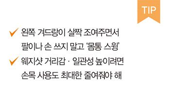일관된 웨지샷을 위한 한 가지 포인트가 더 있습니다. ‘손목 사용 금지’죠. “손목을 많이 사용할 경우 스윙 궤도가 샷을 할 때마다 변하고 볼의 방향성도 떨어지고 탄도나 스핀양도 생각과는 달라질 수 있다. 웨지샷을 할 때 100m 이내에서는 손목 사용을 최대한 하지 않는다고 생각하고 ‘몸통 스윙’에 좀 더 집중하는 것이 좋다”고 설명합니다.
