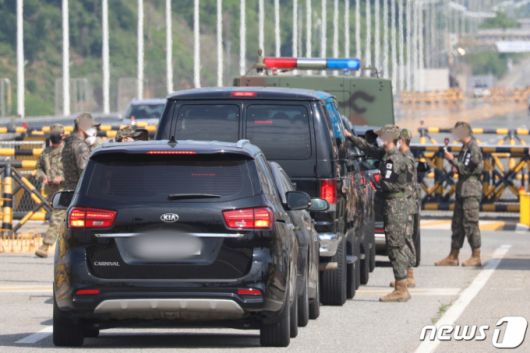 (파주=뉴스1) 성동훈 기자 = 미국의 정보수장 애브릴 헤인스 국가정보국(DNI) 국장이 탑승한 차량 행렬이 13일 오전 경기도 파주시 통일대교를 통해 판문점으로 향하고 있다. 헤인스 국장은 방한 기간 문재인 대통령을 예방하고 비무장지대(DMZ)를 방문할 것으로 알려졌다. 2021.5.13/뉴스1 |