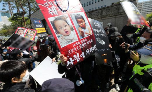 양부모의 학대 끝에 숨진 16개월 된 입양 딸 ‘정인이’의 양부모의 결심 공판이 열린 지난달 14일 오후 서울 양천구 서울남부지방법원 입구에서 시민들이 양모가 탑승한 것으로 보이는 호송차를 향해 손피켓을 들고 항의하고 있다. (사진=뉴시스) |