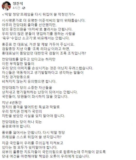 정 의원은 홍 의원을 상대로 "거센 말 제발 거둬달라"며 "검찰총장 지낸 이를 ‘조폭 리더십’이라고 하면, 홍대표님이 몸담았던 대한민국 검찰이 조폭 조직이냐"고 호소했다.