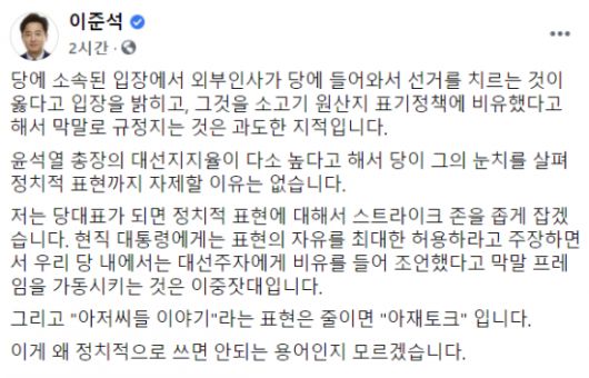 그는 "전당대회를 앞두고 있다고는 하지만 이런 부적절한 말들이 리 당의 이미지를 손상시키는 것은 아닌지 우려스럽다"며 "자신들은 역동적이고 생기발랄하다고 생각하는 말들이 자칫 경거망동으로 비쳐지지 않는지 유의했으면 한다"고 밝혔다.