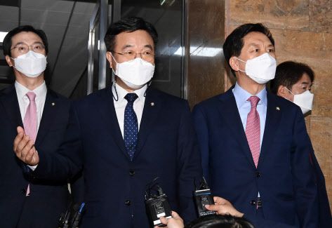 윤호중 더불어민주당 원내대표(왼쪽)와 김기현 국민의힘 원내대표가 13일 오후 서울 여의도 국회의장실에서 박병석 국회의장 주재 여야 원내대표 회동을 마친 뒤 기자들의 질문에 답하고 있다.(사진=연합뉴스) |