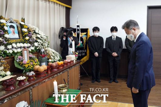 [더팩트ㅣ청와대=허주열 기자] 문재인 대통령이 13일 오후 평택항에서 일하다 산재사고로 숨진 고 이선호 씨의 빈소를 찾아 유가족을 위로했다.