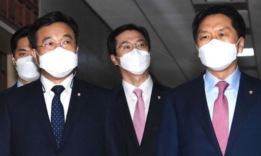 더불어민주당 윤호중 원내대표(왼쪽)와 국민의힘 김기현 원내대표가 13일 박병석 국회의장 주 여야 원내대표 회동을 마친 뒤 의장 집무실을 나서고 있다. 연합뉴스 |