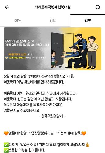 덕진경찰서는 전북대 인근 요식업체 업주와 업무협약을 통해 앱 내 '사장님 광고란'에 아동학대 방지 홍보 포스터를 게시했다고 14일 밝혔다.
