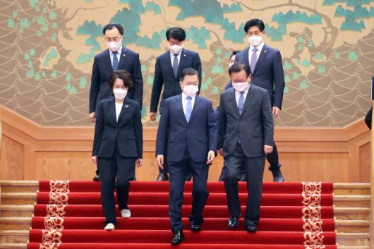 앞줄 왼쪽부터 임혜숙 과기정보통신부 장관, 문재인 대통령, 김부겸 국무총리. 뒷줄 왼쪽부터 문승욱 산업통상자원부 장관, 안경덕 고용노동부 장관, 노형욱 국토교통부 장관.(사진=연합뉴스)문 대통령은 이날 오전 청와대 본관에서 신임 국무총리·국무위원 임명장 수여식을 개최하고 이들에게 임명장을 전달하는 한편, 이들 배우자에게 ‘역경을 이겨내는 강인함’을 뜻하는 캐모마일과 ‘반드시 행복해진다’는 의미의 은방울꽃, ‘헌신’을 의미하는 몬스테라로 구성된 꽃다발을 건넸다.