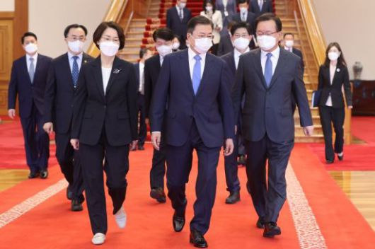 청와대는 이날 문 대통령이 김 총리와 임혜숙 과학기술정보통신부 장관, 문승욱 산업통상자원부 장관, 안경덕 고용노동부 장관, 노형욱 국토교통부 장관 등 국무위원들에게 임명장을 수여한 뒤 인왕실에서 열린 환담에서 이같이 말했다고 밝혔다.