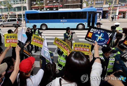 양모 탑승 호송차 향해 항의하는 시민들 |