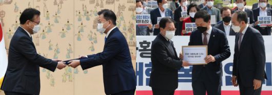 임명장 주고, 항의서 받고…같은 시각 청와대 안팎 문재인 대통령이 14일 오전 청와대에서 김부겸 신임 국무총리에게 임명장을 수여하고 있다(왼쪽 사진). 같은 시각 청와대 분수대 앞에서 김기현 국민의힘 당대표 권한대행 겸 원내대표(가운데)가 유영민 대통령비서실장(왼쪽)에게 더불어민주당의 총리 인준안 강행처리에 대한 항의서한을 전달하고 있다. 청와대사진기자단·국회사진기자단 |