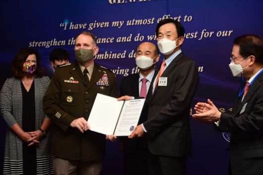 13일 서울 밀레니엄힐튼호텔에서 열린 로버트 에이브럼스 한미연합사령관 환송 행사에서 주한미군전우회 코리아챕터 이서영 회장(오른쪽 2번째)이 에이브럼스 사령관에게 주한미군전우회 회원증을 전달하고 있다. /연합뉴스 |