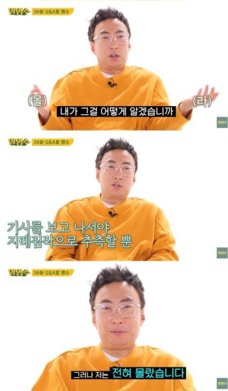 이날 박명수는 “‘아내의 맛’ 조작인지 알고 계셨느냐”는 제작진의 질문에 한껏 당황한 표정을 지었다. 박명수는 “솔직히 이야기해도 되나”라며 “굉장히 민감한 질문이긴 하다. 촬영을 나가면 최선을 다할 뿐이지, 누가 와서 얘기를 안 해주는데 내가 그걸 어떻게 알았겠나. 나중에 그런 일이 터졌을 때 알았다”고 말했다.