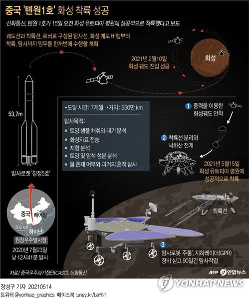 이번 착륙은 중국이 지난해 7월 23일 톈원 1호를 쏘아 올린 지 약 10개월 만으로, 톈원 1호는 발사 후 약 7개월간 4억7천여만km를 비행한 끝에 지난 2월 화성 궤도에 진입해 정보를 수집해왔다.