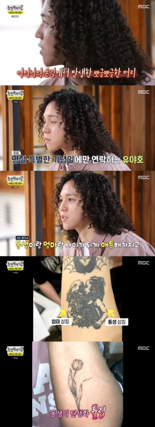 유재석은 "저도 여동생이 둘 있다. 우리는 명절, 특별한 기념일 아니면 연락을 안 한다"라며 깜짝 놀랐고, 원슈타인은 "워낙 동생이랑 엄마랑 사이가 애틋하다. 저는 팔에 타투를 했었다. 골든 리트리버가 어머니를 상징하는 거고 오른쪽이 동생이다. 동생의 탄생화가 튤립이다. (동생은) 지금 미용을 한다. 벌써 실장님이 돼서 뿌듯하다"라며 털어놨다.