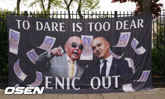결국 팬들은 직접 행동에 나섰다. 토트넘 팬들은 레비 회장과 대화를 거부한 채 길거리로 나왔다. 그들은 들은 'ENIC OUT'과 '레비 OUT'이라는 배너를 들고 구단 대주주인 ENIC그룹과 레비 회장의 퇴진을 요구했다. / 10bird@osen.co.kr