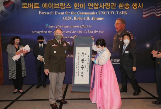 로버트 에이브럼스 주한미군사령관 겸 한미연합사령관이 지난 13일 오전 서울 중구 밀레니엄힐튼호텔에서 한미동맹재단 주관으로 열린 환송 행사에서 우현의 한미동맹친선협회장으로부터 한글 이름 족자를 선물 받고 있다.성인 '우(禹)'는 에이브럼스의 'ㅇ'에서 땄고 본관은 미군기지가 있는 평택이라고 한미동맹친선협회는 밝혔다. [연합] |