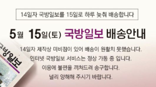 국방일보 측은 홈페이지에도 "제작상 미비점이 있어서 14일자를 15일로 하루 늦춰서 배송한다"며 "이용에 불편을 끼쳐드려 송구하다"고 밝혔습니다.