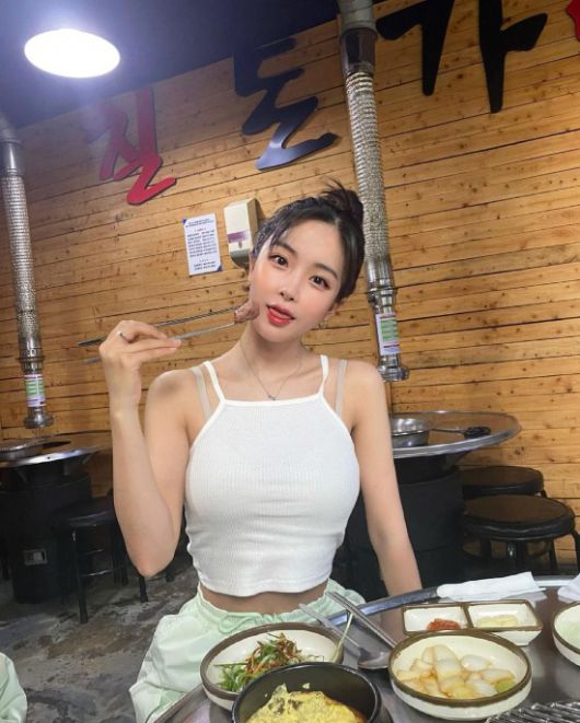 공개된 사진 속 조현영은 민소매 티셔츠를 입은 채 고기를 구워 먹으며 인증샷을 남기고 있는 모습. 글래머 몸매가 인상적이다.