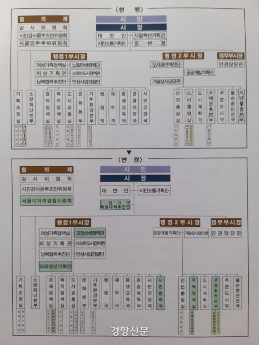 경향신문은 서울시가 조직개편을 위해 작성한 ‘제38대 서울시정 실행력 강화를 위한 조직개편’이란 내부 문서를 단독으로 확보해 조직개편의 배경과 세부 방안을 확인했다. 특히 서울시의회는 물론 서울시 안팎에서 조직개편을 둘러싸고 제기되고 있는 쟁점들을 살펴봤다.