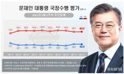 이날 리얼미터가 YTN 의뢰로 지난 10일부터 14일까지 5일간 전국 18세 이상 유권자 2514명을 대상으로 실시한 여론조사 결과에서 문 대통령 국정수행에 대한 긍정평가는 지난주 5월1주차 주간집계와 같은 36.0%로 집계됐다. 부정평가는 전주보다 0.2%포인트 오른 60.5%로 나와 긍정평가와 부정평가 간 차이는 24.5%포인트로 오차범위 밖이었다. '모름·무응답'은 3.5%다.