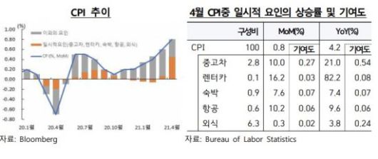 [아시아경제 김은별 기자] 예상보다 높은 수준으로 뛴 미국의 4월 소비자물가지수(CPI) 상승률 중 일시적 요인의 기여도는 약 60%에 달하는 것으로 나타났다. 일시적 요인이 상당부분 작용했지만, 주택가격이 지속적으로 오르고 있고 경기회복으로 노동수요가 늘고 있는 점은 장기 인플레이션 압력으로 작용할 가능성이 있다는 평가다.