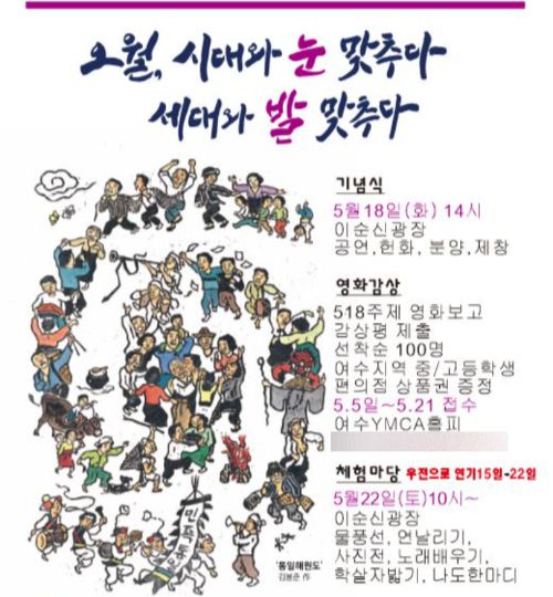여수YMCA와 전교조 여수지회, 여수시민사회단체연대회의 등은 18일 오후 2시 여수 이순신광장에서 5·18민중항쟁 기념행사를 개최한다.