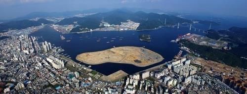 마산해양신도시 인공섬(마산항내 가운데 둥그런 섬) 전경. |