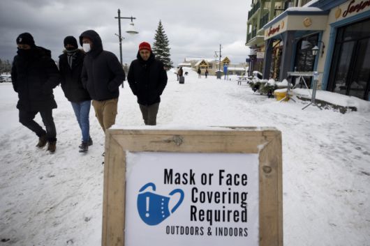 지난해 12월 캐나다 온타리오주에 신종 코로나바이러스 감염증(코로나19) 감염 방지를 위한 마스크 착용 안내판이 길거리에 설치돼있다./사진=AP 연합 |