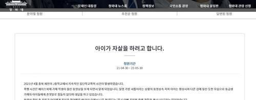 이어 "3학년이 돼서는 둔기로 다리를 맞아 전치 5주의 근육파열 진단을 받았고, 제 아이가 소금과 후추, 돌, 나뭇가지를 넣은 짜장면을 먹지 않자 머리를 둔기로 때려 전치 3주의 뇌진탕 피해를 주기도 했다"고 적었다. 청원인은 "가해 학생이 SNS에 올린 '가방셔틀' 동영상을 보고서야 피해 사실을 알았다"며 "아이가 폭력과 괴롭힘에 너무 힘이 들어 자살 시도까지 여러 차례 했다고 말했다"고 토로했다.