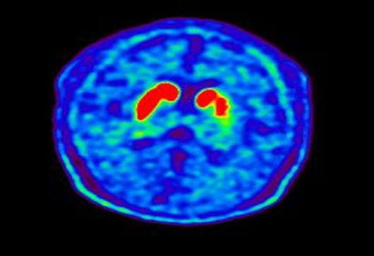 파킨슨병 환자의 뇌 핵의학 영상(도파민 분비 부위 퇴화). |