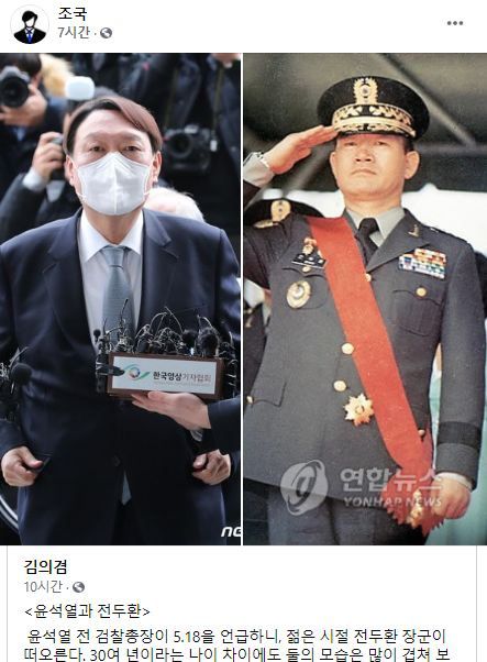 윤석열 전 검찰총장과 전두환 전 대통령을 비교한 김의겸 열린민주당 의원의 페북을 공유한 조국 전 법무부 장관의 페이스북 페이지. 인터넷 캡처 |
