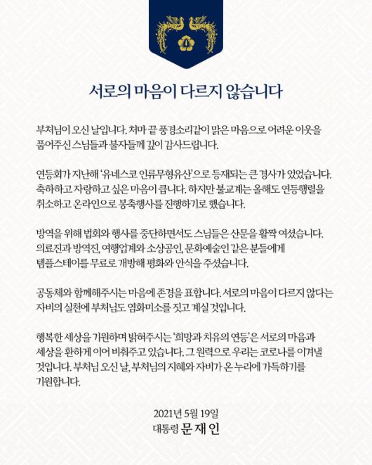 문 대통령은 “공동체와 함께해주시는 마음에 존경을 표한다”라며 “서로의 마음이 다르지 않다는 자비의 실천에 부처님도 염화미소를 짓고 계실 것”이라고 썼다.