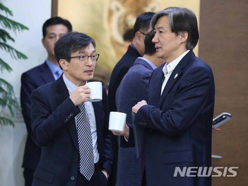 2018년 2월 5일 당시 조국 민정수석(오른쪽)과 김의겸 청와대 대변인이 수석보좌관회의에 앞서 대화를 나누고 있다. 2018.02.05./사진제공=뉴시스 |