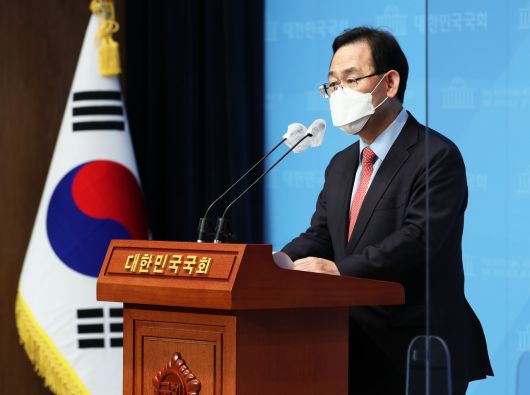 국민의힘 당 대표 경선에 나선 주호영 의원이 19일 오후 국회 소통관에서 기자회견을 하고 있다. [연합] |