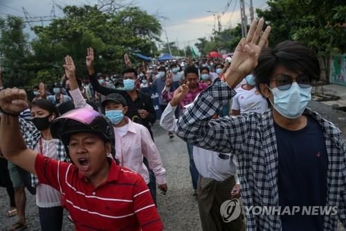 (만달레이 EPA=연합뉴스) 미얀마 지방도시 만달레이에서 지난 12일 시민들이 도로를 행진하며 군부 쿠데타에 저항하는 표시로 세 손가락 들어보이고 있다. jsmoon@yna.co.kr |