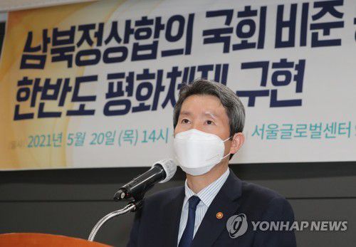(서울=연합뉴스) 배영경 기자 = 이인영 통일부 장관은 20일 남북 정상 간 합의 이행은 보수·진보의 문제로 볼 것이 아니라며 판문점선언의 국회 비준 동의 필요성을 강조했다.