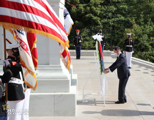 문 대통령은 이날 오전 워싱턴 인근 알링턴 국립묘지를 방문해 무명용사의 묘를 찾아 참배했다. 이곳은 한국전 전사자를 포함해 참전용사 및 가족 약 40만명이 잠들어 있는 미국 최대 국립묘지 중 하나다. 미국 대통령이 취임 후 가장 먼저 참배하는 곳이기도 하다. 취임 후 네 번째 미국 순방길에 오른 문 대통령이 알링턴 국립묘지를 방문한 것은 이번이 처음이다. 문 대통령은 전사자들의 희생을 기리는 기념패를 기증했다. 기념패는 국군유해발굴단이 발굴한 한국전쟁 참전 미군의 피복류가 활용돼 만들어졌다. 독수리 문양 단추, 별 문양 단추, ‘US’라 쓰인 배지 등이 기념패 제작에 쓰였다.