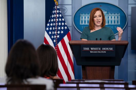 젠 사키 미국 백악관 대변인이 20일(현지시간) 워싱턴DC 백악관에서 언론 브리핑을 하고 있다. /AP 연합뉴스 |