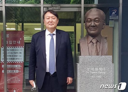 윤석열 전 검찰총장이 지난 17일 서울대 반도체 공동연구소를 방문해 반도체 물리학자인 고(故) 강대원 박사 흉상 앞에서 기념 촬영을 하고 있다. 윤 전 총장이 지난 3월 사퇴한 뒤 국내 주요 산업분야 현장을 찾은 것은 이번이 처음이다. /사진=뉴스1 |