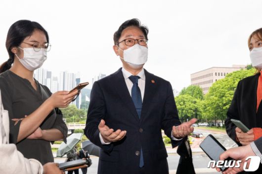 (과천=뉴스1) 유승관 기자 = 박범계 법무부 장관이 21일 경기 과천시 과천정부청사 내 법무부로 출근하며 취재진 질문에 답하고 있다. 2021.5.21/뉴스1 |